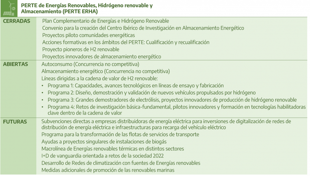 El 14 de diciembre se aprobó el último PERTE en 2021, el PERTE de energías renovables, hidrógeno renovable y almacenamiento (ERHA). Con él, se quiere apuntalar las áreas asociadas a la transición energética en la que España está bien posicionada, como las energías renovables, la electrónica de potencia, el almacenamiento o el hidrógeno renovable, y reforzar aquellas con menor presencia. La suma a movilizar asciende a los 16.300 millones de euros entre inversión pública y privada.