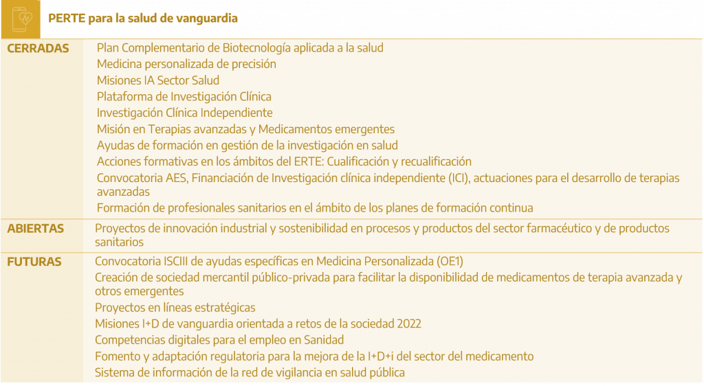 Posteriormente se aprobó el PERTE para la salud de vanguardia, el 30 de noviembre de 2021. Con él, se pretende mejorar la salud de la población a partir de la innovación diagnóstica, terapéutica y preventiva en el Sistema Nacional de Salud. En total, la inversión conjunta esperada asciende a 1.469 millones de euros.