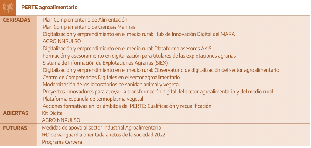 Ya en 2022, el 8 de febrero, se aprobó el PERTE agroalimentario, cuyo objetivo principal es promover el desarrollo integrado de toda la cadena agroalimentaria a través de la digitalización de los procesos y de la incorporación de conocimiento e innovación. La inversión pública ascendería a 1.002,91 millones de euros.