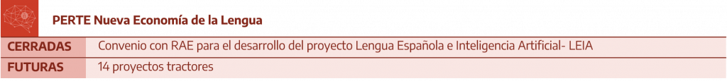 El 1 de marzo se aprobó el PERTE Nueva economía de la lengua, que persigue desarrollar las oportunidades que presenta el español como un activo para el impulso de la economía. La inversión pública alcanza los 1.100 millones y espera movilizar otros 1.000 millones de inversión privada. Dentro de este PERTE, aunque sí se ha cerrado un convenio con la RAE, no se ha publicado aún ninguna convocatoria, algo que se repetirá en varios de los siguientes.