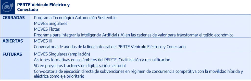 El primer PERTE en aprobarse fue el PERTE para el desarrollo del Vehículo Eléctrico y Conectado el 13 de julio de 2021. Actualmente, uno de los más avanzados en cuanto a publicación de convocatorias. Su eje central es la creación del ecosistema necesario para el desarrollo y fabricación de vehículos eléctricos y conectados mediante el impulso a la industria del automóvil para dar respuesta a la nueva movilidad sostenible y conectada. Se espera movilizar más de 24.000 millones de euros entre inversión pública y privada.